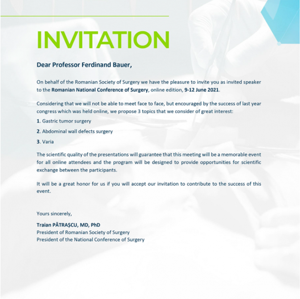 On behalf of the Romanian Society of Surgery, I would like to thank you for your participation in the online edition of the National Surgery Conference, this marking a new page in the history of Romanian surgery.